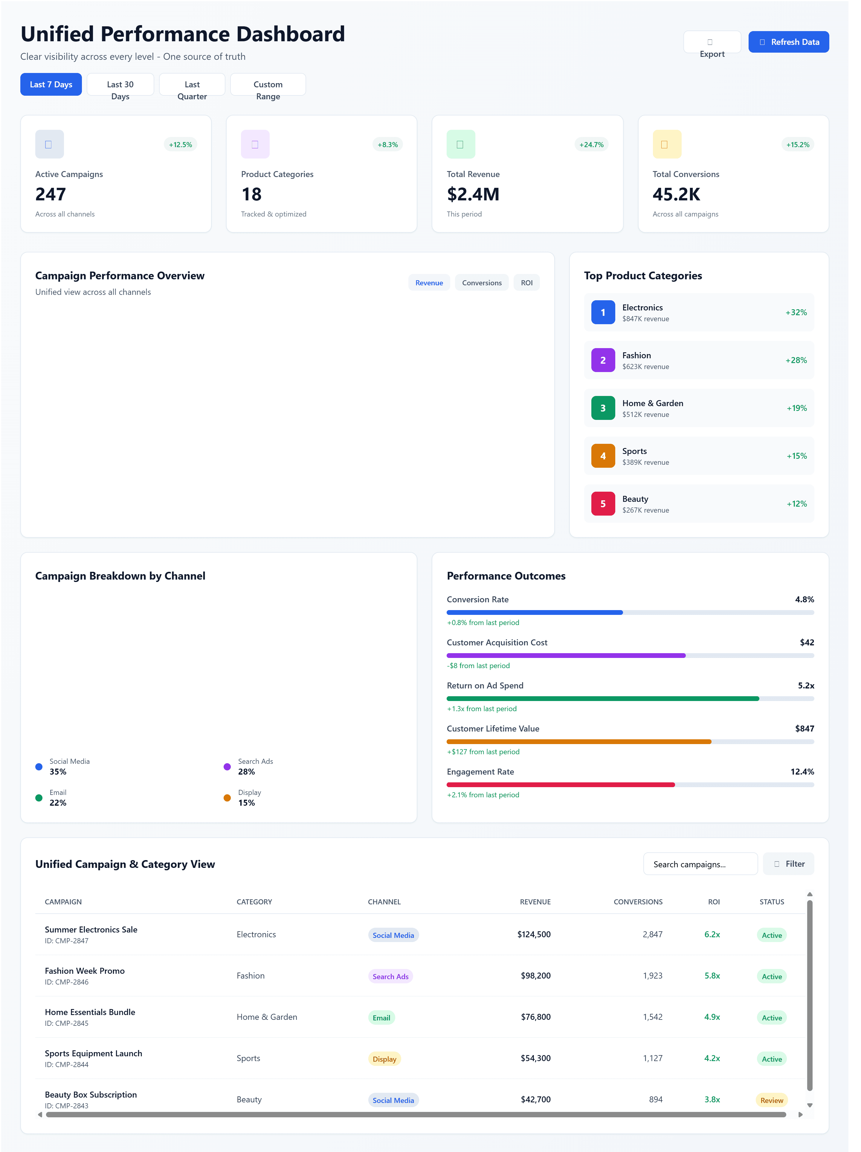 Bring together all campaigns, product categories, and performance outcomes in one holistic dashboard. Give your team a unified, reliable source of truth for confident decision-making.